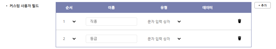 사용자 및 장치 관리 섹션의 커스텀 사용자 필드 항목에서 + 추가 버튼을 클릭해 이름을 입력하고 유형을 선택하세요. 추가한 커스텀 사용자 필드의 순서대로 카드 템플릿의 속성 ID가 결정됩니다.