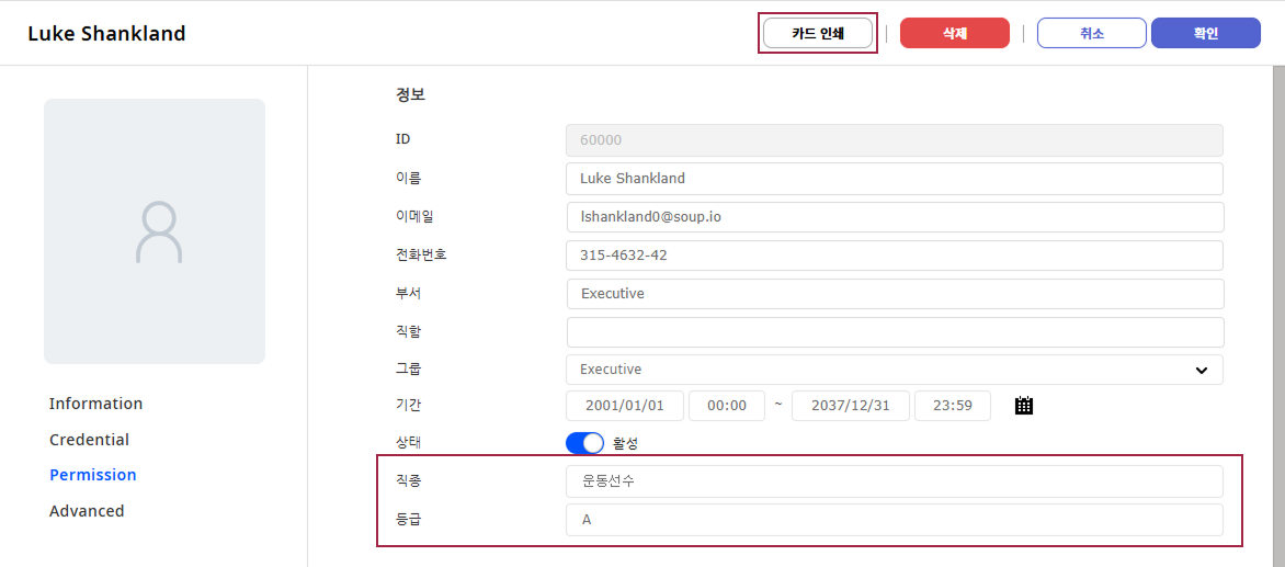 추가한 커스텀 사용자 필드 항목을 확인할 수 있습니다. 해당 양식에 맞게 입력하고 카드 인쇄 버튼을 클릭하세요.