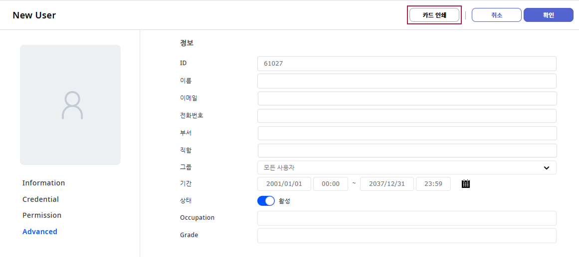 Administrator 정보를 가진 카드 템플릿을 테스트 인쇄할 수 있습니다.
