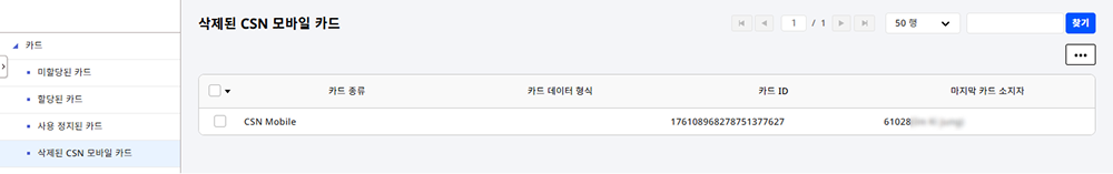 삭제된 CSN 모바일 카드는 설정 → 카드의 삭제된 CSN 모바일 카드 목록에 기록됩니다. 목록에서 카드 종류, 카드 데이터 형식, 카드 ID, 마지막 카드 소지자를 확인할 수 있습니다.