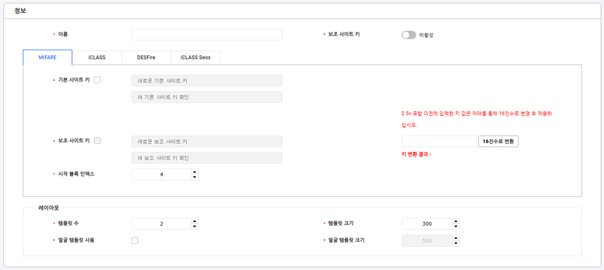 - 블록 인덱스: 각 템플릿이 저장될 시작 블록을 선택하세요. 이 블록은 사용자 정보가 저장될 블록의 인덱스이며, 사용자가 이미 스마트 카드를 사용하고 있다면 저장 가능한 블록을 설정하세요.
