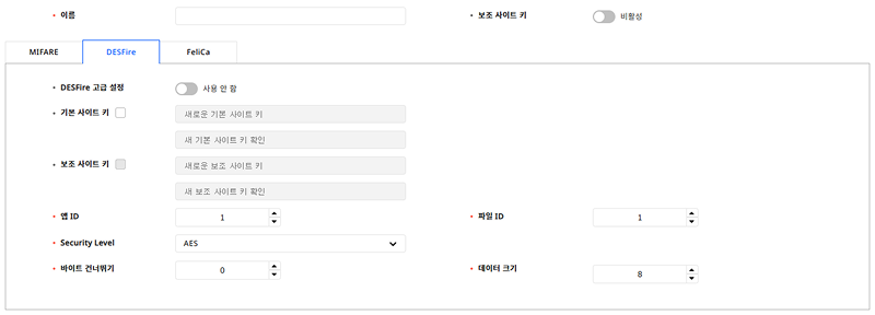 - DESFire 고급 설정: 타사에서 발급한 DESFire 카드를 사용할 수 있습니다. DESFire만 설정할 수 있습니다.
