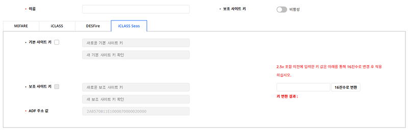 기본 사이트 키와 보조 사이트 키는 16진수만 지원합니다. 각 입력 필드에 사용할 키 값을 입력한 후 16진수로 변환 버튼을 클릭하세요. 변환된 값을 사이트 키로 사용하세요.