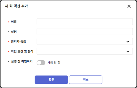 실행 전 확인하기: 이 옵션을 활성화하면 퀵 액션 버튼을 눌렀을 때 실행 여부를 묻는 확인 팝업창이 나타납니다.