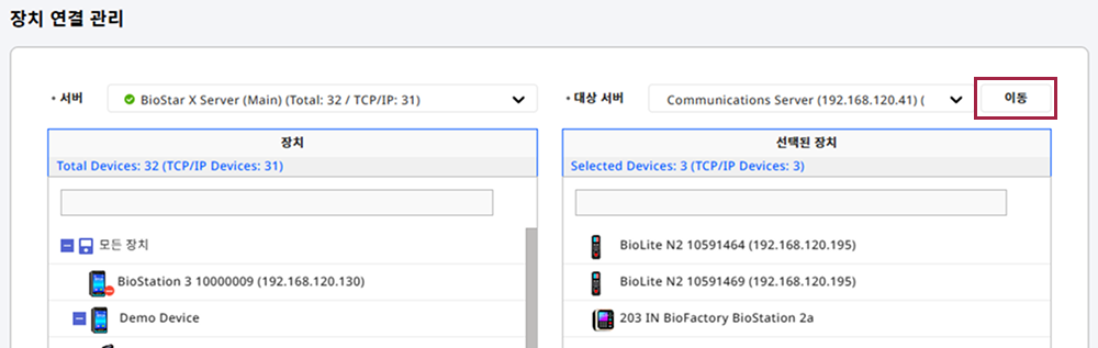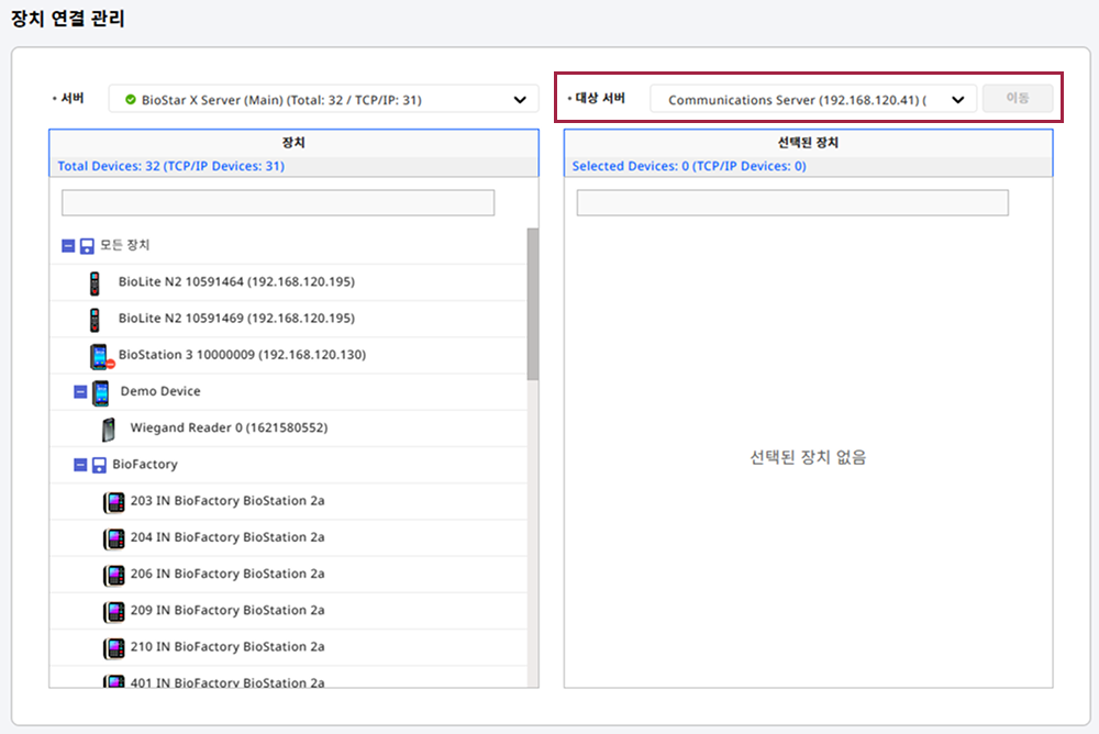 왼쪽에 서버 항목에서 이동시키려는 장치가 등록된 서버를 선택하세요.
