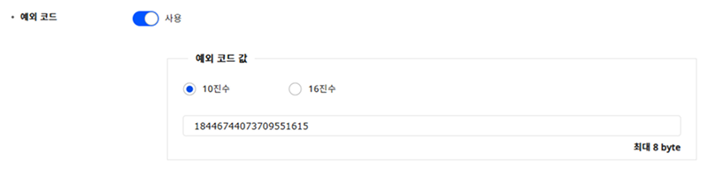 예외 코드: 인텔리전트 슬레이브를 사용할 때 인증 실패 등 예외 상황이 발생하면, 예외 코드를 10진수(0~18446744073709551615) 또는 16진수(0~FFFFFFFFFFFFFFFF) 형식으로 입력해 정확한 로그를 남길 수 있습니다. 16진수는 숫자 또는 영문자로 입력할 수 있습니다.