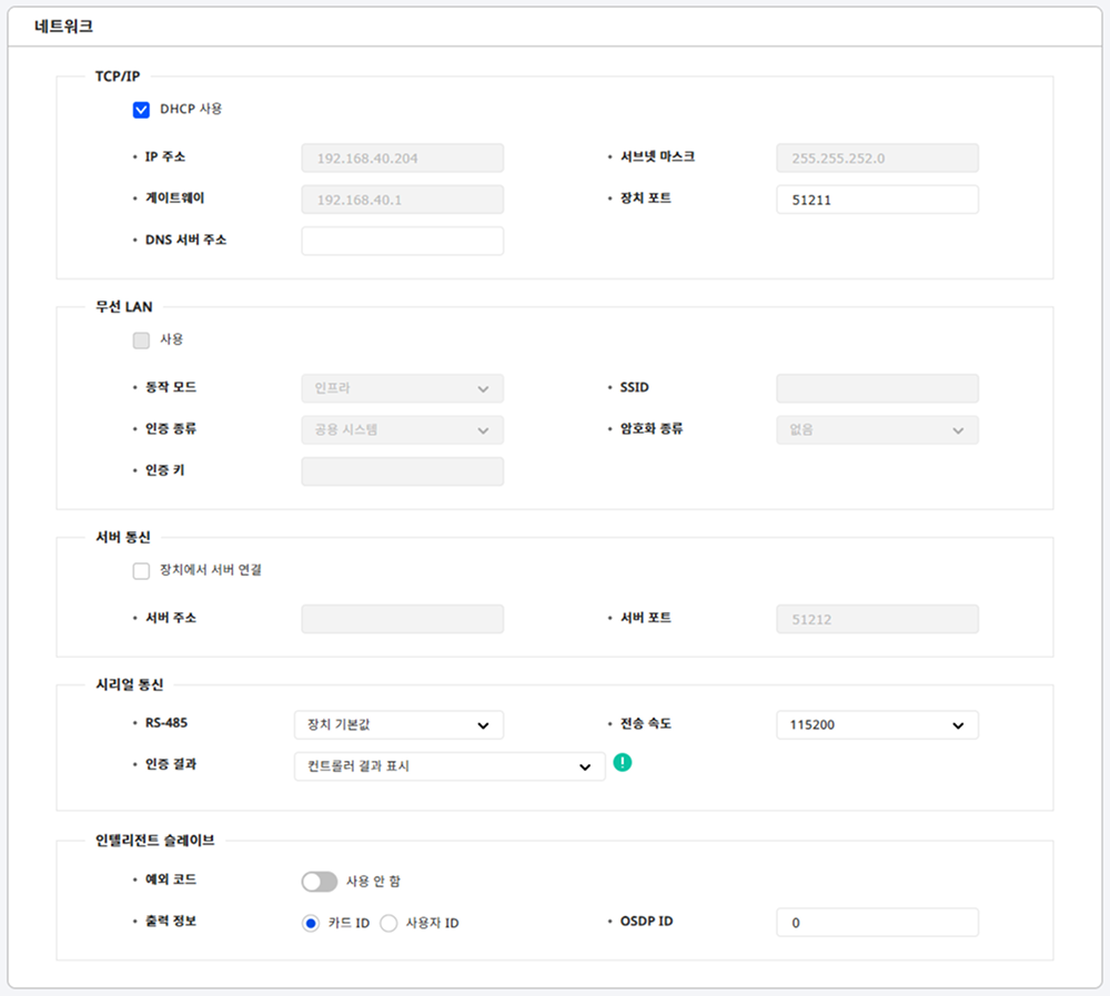 인증 결과 옵션은 RS-485 옵션을 슬레이브 또는 장치 기본값을 선택했을 때 활성화됩니다.