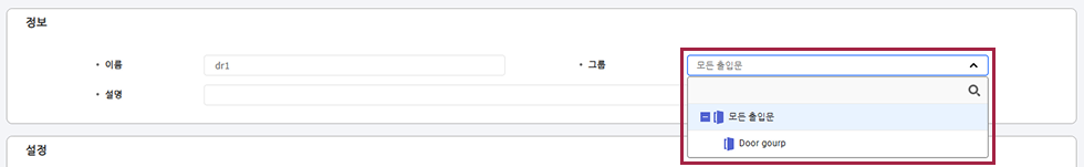 출입문 정보 수정 화면이 나타나면 정보 섹션의 그룹 옵션을 클릭하세요.