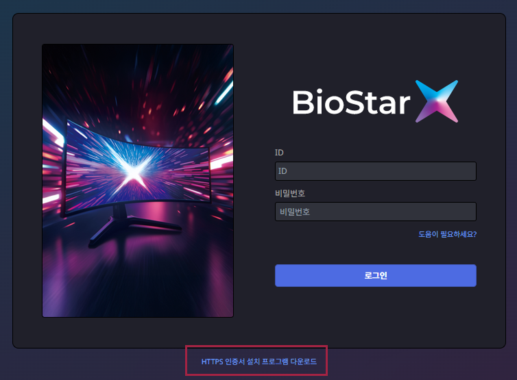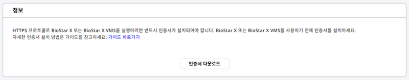 BioStar X를 설치한 클라이언트 PC에서 로그인 화면 또는 설정 → 서버 → HTTPS에서 HTTPS 인증서 설치 프로그램(cert-register.zip)을 다운로드하세요.