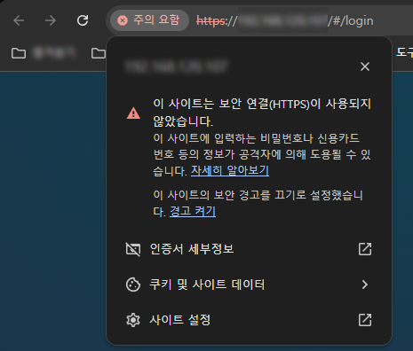 HTTPS 인증서가 설치되지 않은 상태에서 BioStar X에 접속하면 웹 브라우저에서 다음과 같은 보안 경고가 표시됩니다.