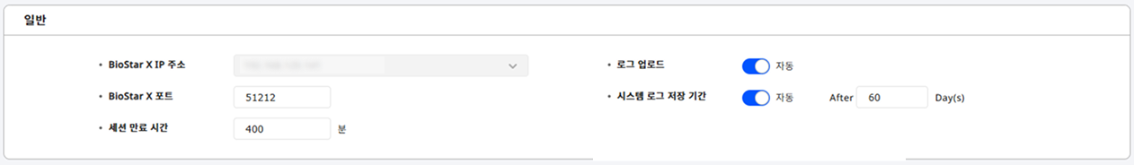 일반: IP 주소, 포트 번호, 세션 만료 시간, 이벤트 로그 업로드 방법, 로그 저장 기간을 설정할 수 있습니다.