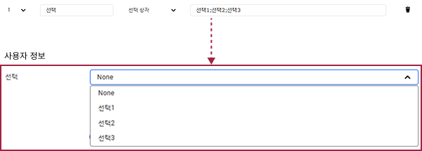 선택 상자: 최대 20개 세부 항목을 32자로 추가할 수 있으며, 각 항목은 세미 콜론(;) 기호로 구분합니다. (예, 선택1;선택2;선택3)