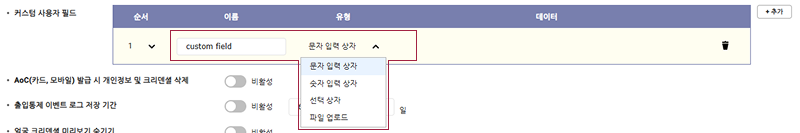 커스텀 사용자 필드의 이름을 입력하고 유형에서 원하는 항목을 선택하세요.