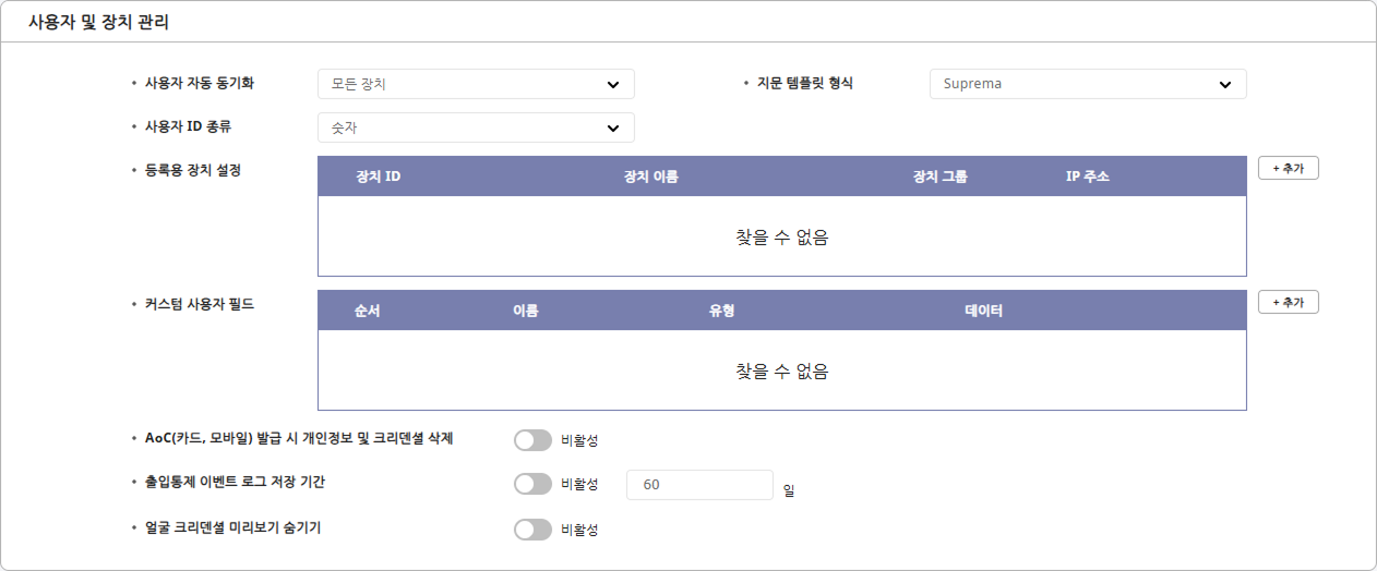 사용자 및 장치 관리 섹션에서는 사용자와 장치간 동기화 및 인증 방법을 설정할 수 있습니다.