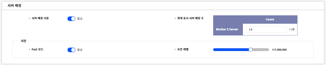 서버 매칭 섹션에서는 사용자 정보를 장치에서 인증하지 않고 BioStar X에서 인증할 수 있는 서버 매칭 기능을 설정할 수 있습니다.