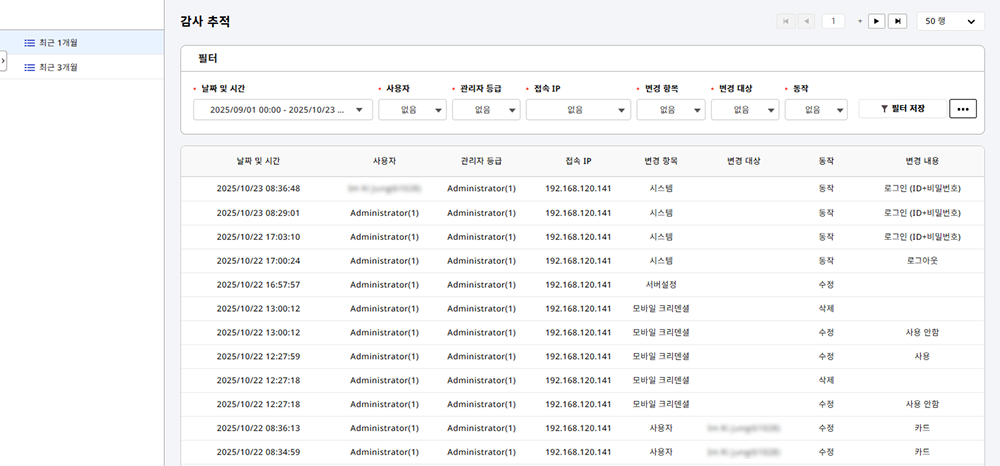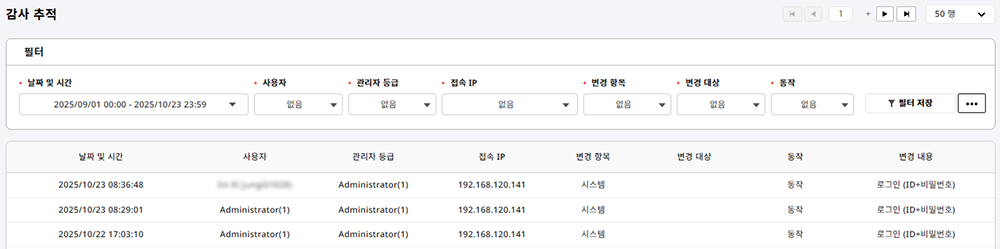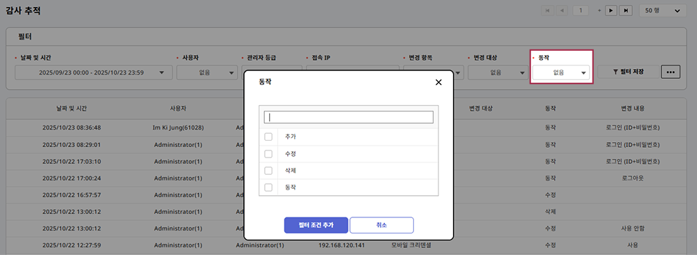 감사 추적 목록을 효율적으로 탐색하기 위해 다양한 조건으로 필터링하세요.