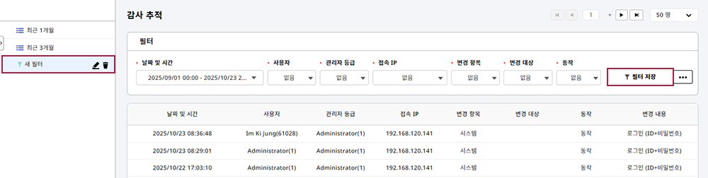 필터를 설정하고 필터 섹션의 필터 저장 버튼을 클릭하면 화면 왼쪽 필터 목록에 설정한 필터를 저장할 수 있습니다.