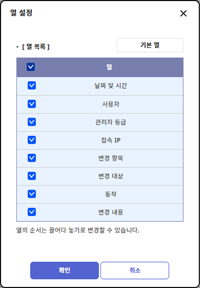 감사 추적 목록의 컬럼의 위치를 변경하거나 숨길 수 있습니다. 필터 섹션의 가장 오른쪽에 → 열 설정을 클릭하세요.