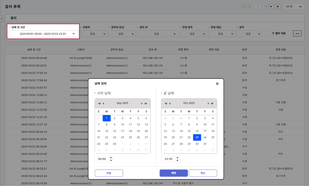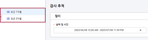 조회할 기간을 설정하여 특정 기간의 감사 추적 이력을 확인하세요.
