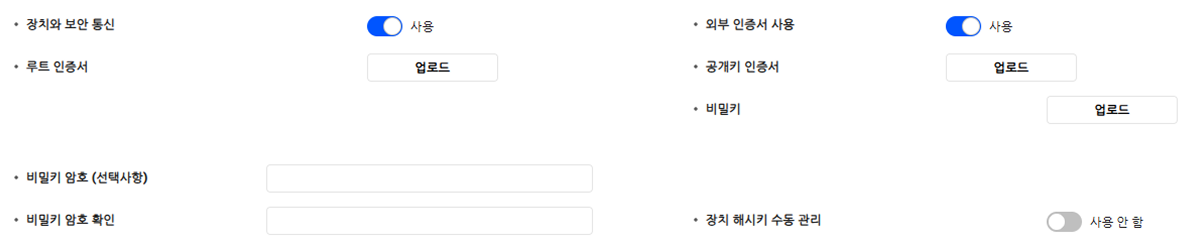 외부 인증서를 사용하려면 외부 인증서 사용 옵션을 켜고 루트 인증서, 공개키 인증서, 비밀키 파일을 업로드 해야 합니다.