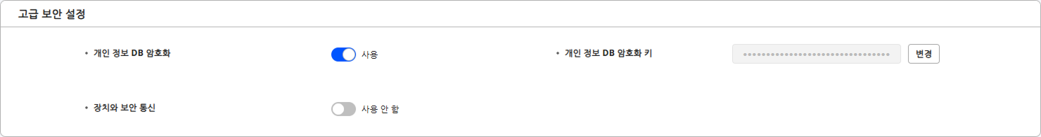 개인 정보 DB 암호화 키: 사용자의 개인 정보를 안전하게 보호하기 위해 데이터베이스에 저장된 정보를 암호화하거나 복호화할 때 사용합니다. 변경 버튼을 클릭하고 새 암호화 키 값을 설정하세요. 암호화 키를 변경하면 기존에 암호화된 데이터를 재암호화합니다.