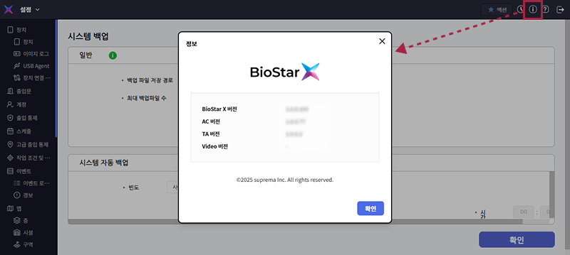 백업 시점의 BioStar X 버전과 현재 버전이 다를 경우 복원을 진행할 수 없습니다. BioStar X의 버전을 확인하려면 화면 오른쪽 최상단의 버튼을 클릭하세요.