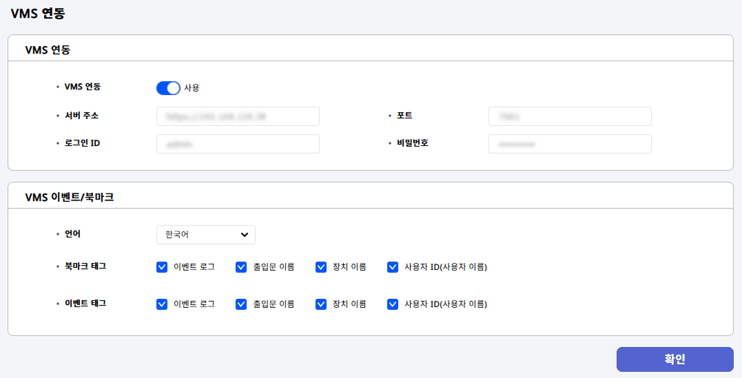 연동한 VMS 서버에 북마크 태그, 이벤트 태그 정보를 전달할 수 있습니다. 이때, 이벤트 로그, 출입문 이름, 장치 이름, 사용자 아이디를 함께 전달할 수 있도록 선택할 수 있습니다. 원하는 옵션을 선택하고 화면 오른쪽 하단의 확인 버튼을 클릭하세요.