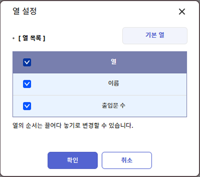 열 설정 창이 나타나면 표시할 열의 체크박스를 클릭해 추가하거나 숨김 설정을 할 수 있습니다. 드래그 앤 드롭으로 열의 순서를 변경할 수도 있습니다.