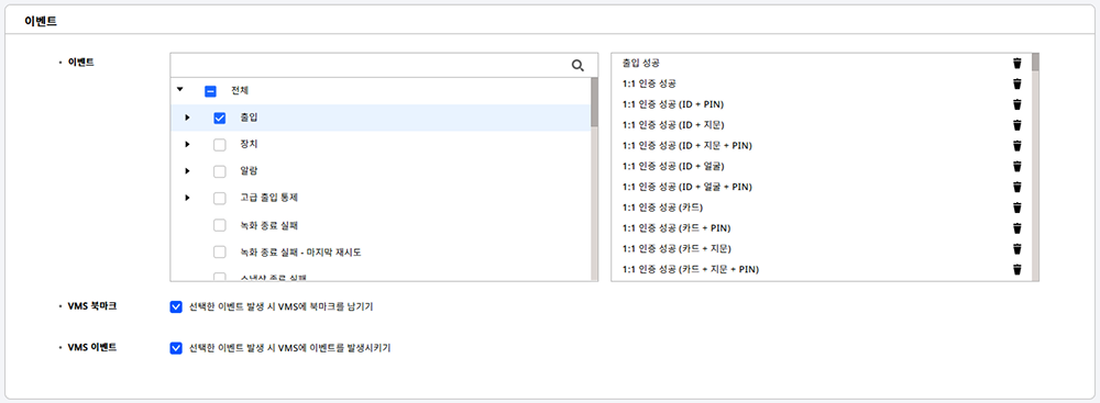 VMS 이벤트: 이벤트 목록에서 선택한 이벤트가 발생할 때 VMS 서버에 이벤트 기록을 생성할지 설정할 수 있습니다.