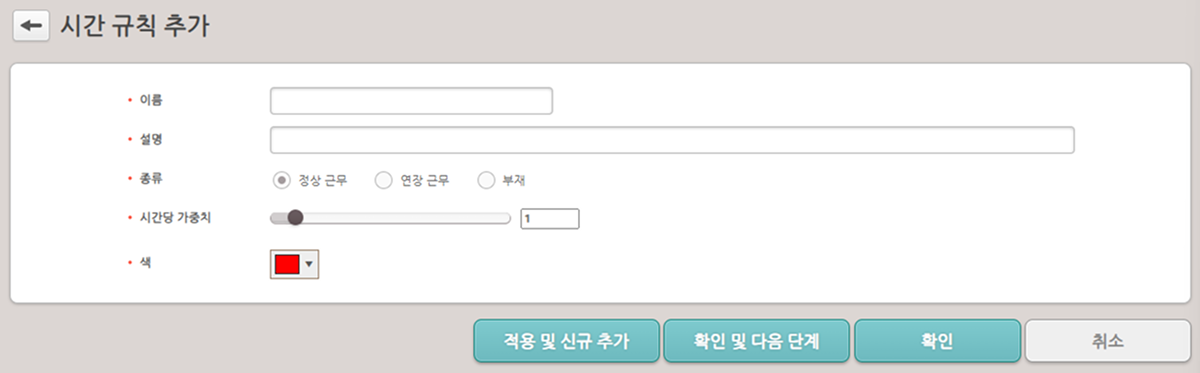 근무 시간 계산에 사용될 시간 규칙 설정을 안내합니다. 정상 근무용 시간 규칙, 연장 근무용 시간 규칙, 부재용 시간 규칙을 설정할 수 있습니다. 각 시간 규칙은 시간당 가중치를 다르게 지정하여 사용할 수 있습니다.