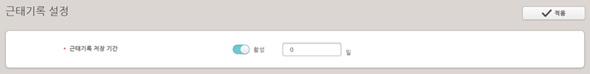 근태 기록을 저장할 기간을 설정할 수 있습니다. 근태기록 저장 기간 옵션을 활성으로 설정하고 기간을 입력하세요. 설정을 저장하려면 적용 버튼을 클릭하세요.