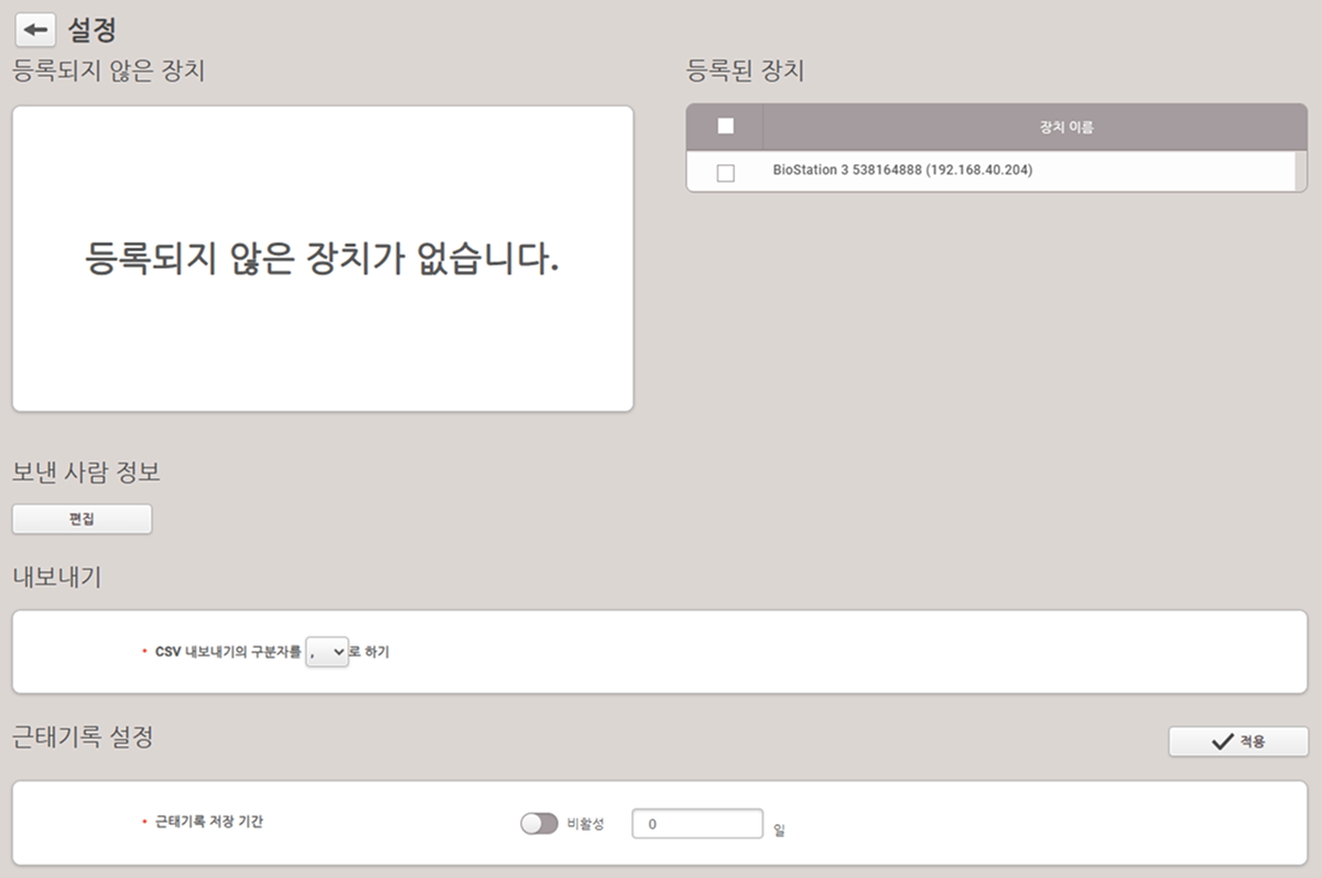 설정 → 장치 메뉴에서 등록한 장치를 삭제하면, 등록된 근태 관리 장치도 자동 삭제됩니다.