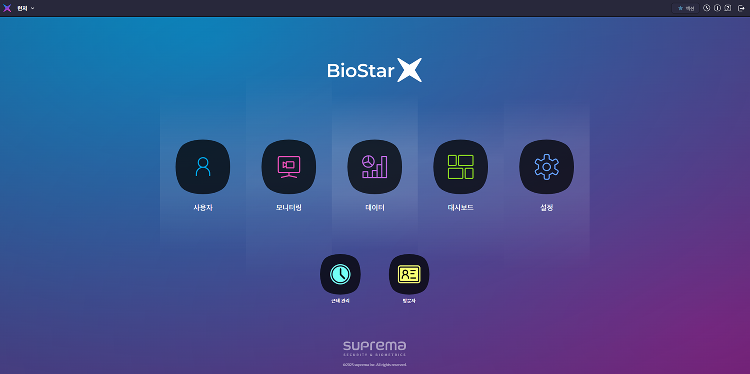런처 페이지는 로그인 후 처음 접할 수 있는 BioStar X의 시작 페이지로, 사용자가 BioStar X의 주요 기능에 접근할 수 있는 중심 허브 역할을 합니다. 이 페이지는 사용자가 BioStar X의 모든 기능을 쉽게 탐색하고 사용할 수 있도록 설계되었습니다. 런처 페이지의 UI 구성 요소를 살펴보면 다음과 같습니다.