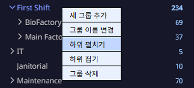 그룹 내 하위 그룹이 있다면 하위 그룹을 확장하거나 축소할 수 있습니다. 상위 그룹을 선택하고 마우스 오른쪽 버튼을 클릭하세요. 팝업 메뉴에서 하위 펼치기 또는 하위 접기를 클릭하세요.