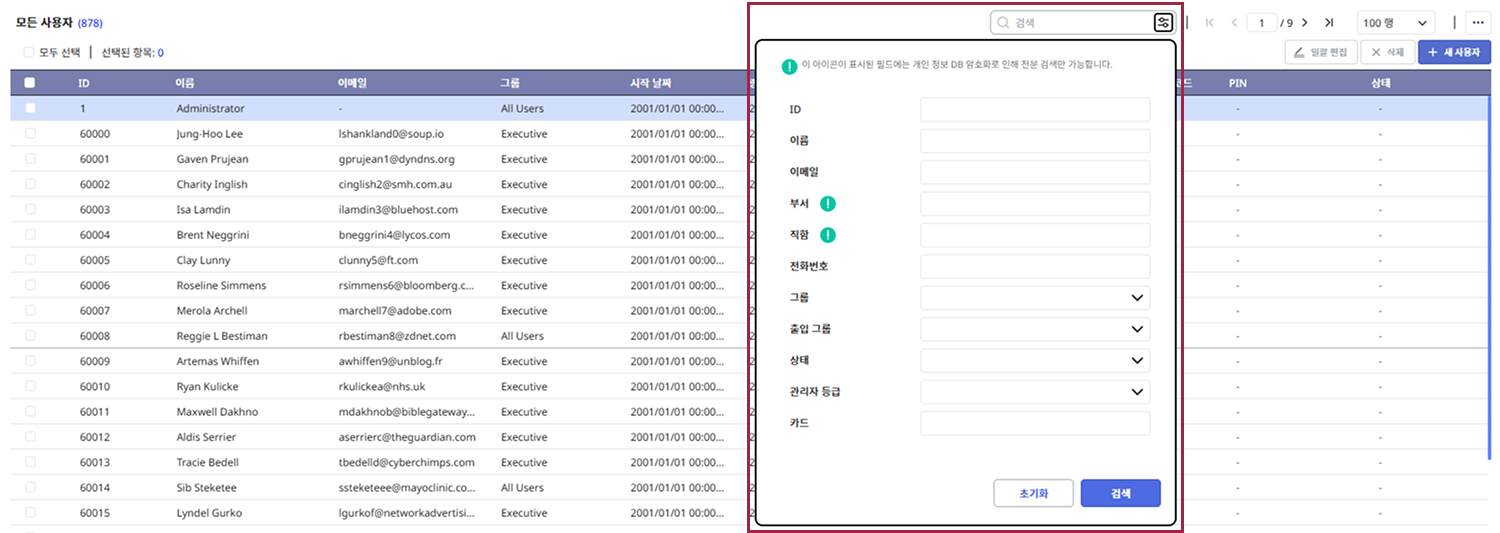 입력 필드 중 아이콘이 표시된 항목은 개인 정보 DB 암호화로 인해 전문만 검색할 수 있습니다.