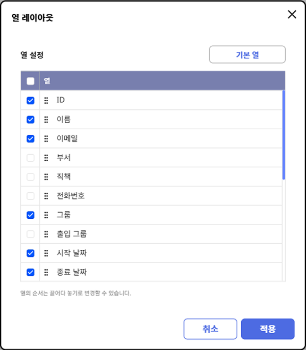 사용자 목록에서 표시되는 열(Column) 설정을 변경할 수 있습니다. 열 설정을 통해 표시할 열을 선택하거나 열의 순서를 변경할 수 있습니다.
