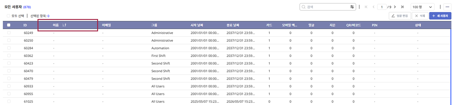 사용자 목록의 정렬 기준을 변경할 수 있습니다. 목록 상단의 열 제목을 클릭하면 오름차순 또는 내림차순으로 정렬할 수 있습니다. 예를 들어, 이름 열 제목을 클릭하면 사용자의 이름을 기준으로 오름차순 또는 내림차순으로 정렬됩니다. 이때 클릭한 항목에는 오름차순() 또는 내림차순() 아이콘이 표시됩니다.