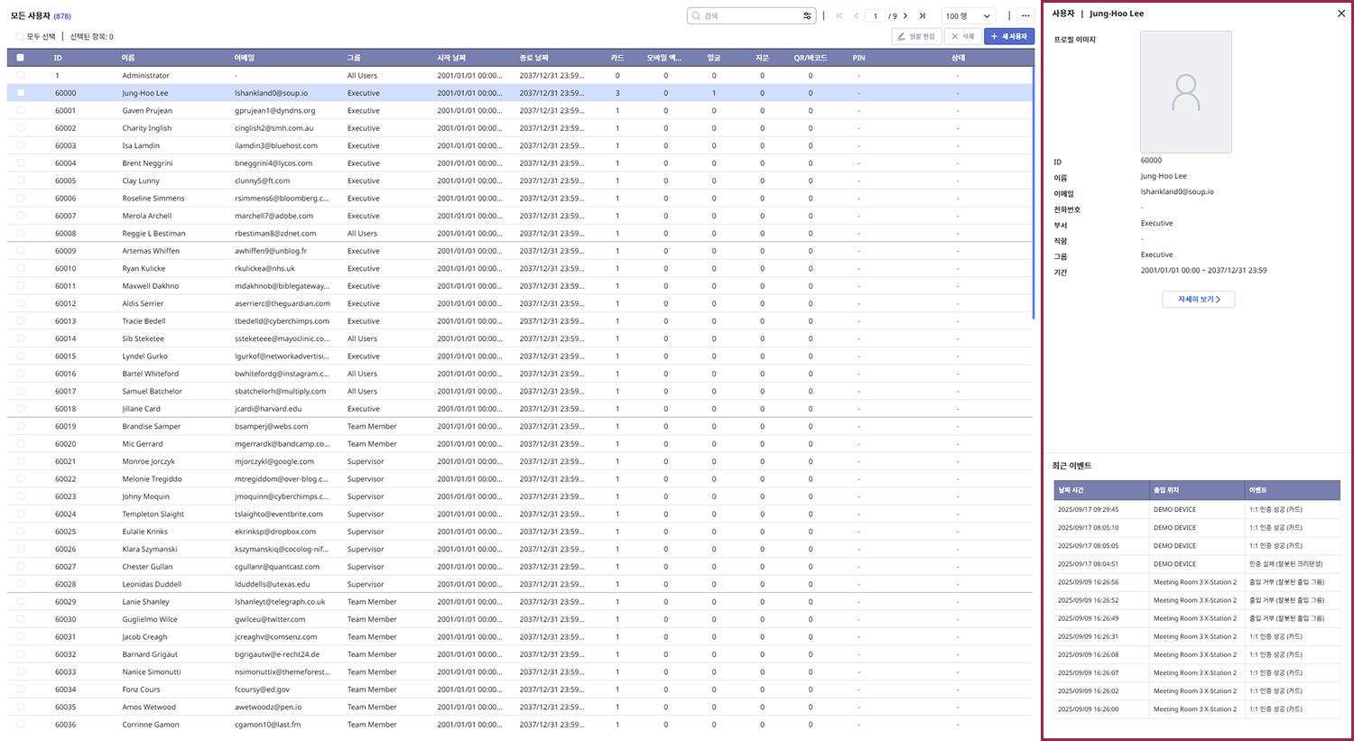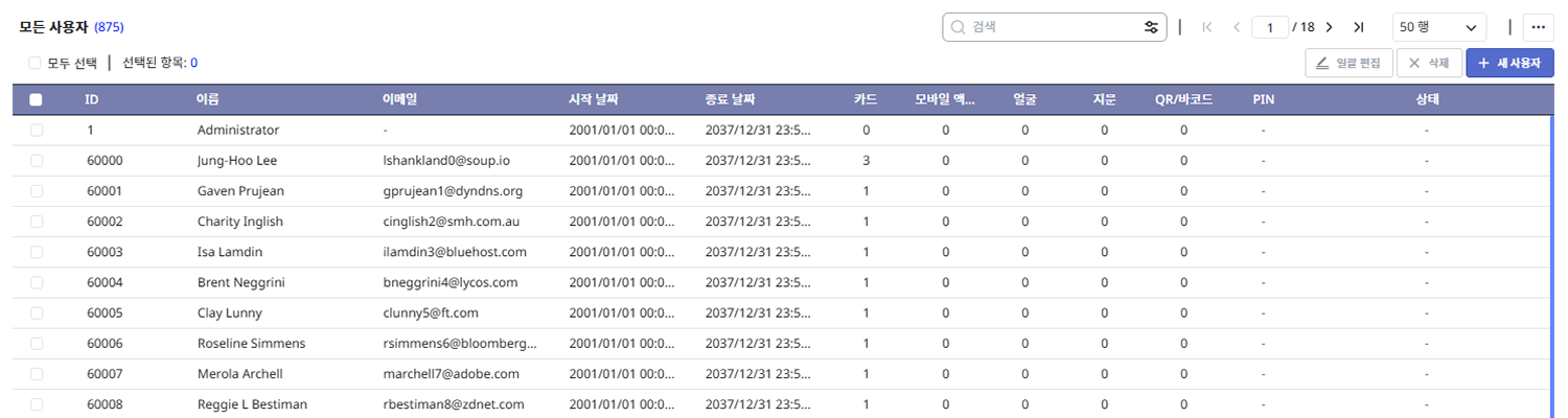 사용자 목록 페이지에서는 사용자의 기본 정보와 상태를 확인할 수 있으며, 각 사용자의 상세 정보를 열람하거나 수정할 수 있습니다.
