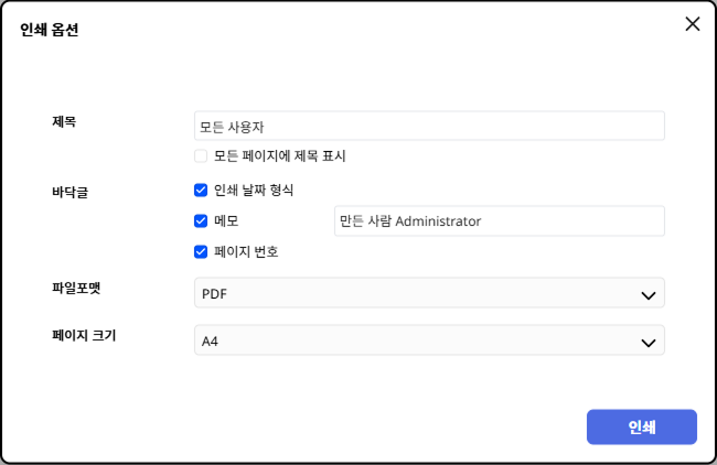 인쇄 옵션 창이 나타나면 파일포맷 옵션에서 원하는 포맷을 선택하고 나머지 옵션을 설정하세요.