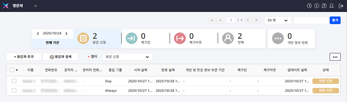 방문자 기능을 사용해 방문 신청용 PC에 방문 신청 페이지를 생성하고, 방문자 관리용 PC에서 방문자의 출입을 관리할 수 있습니다.