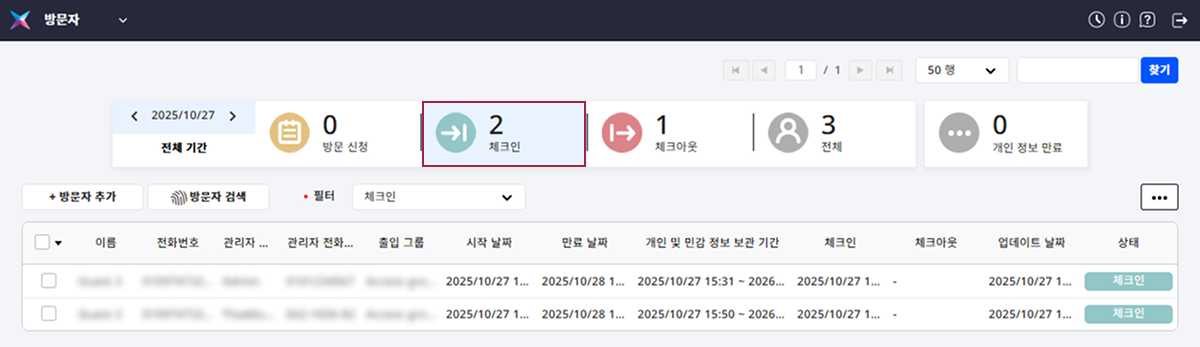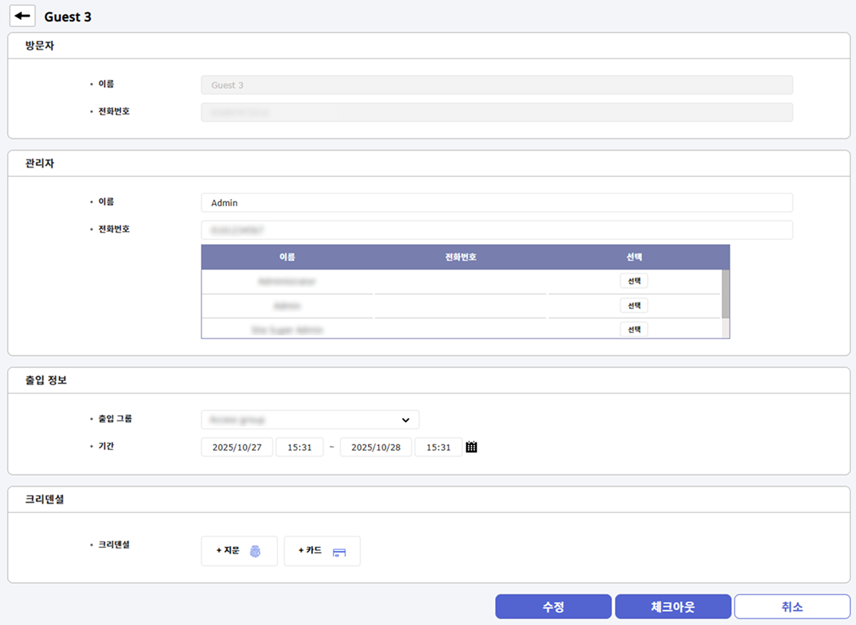 체크인 상태의 방문자를 확인하고 방문 정보를 수정하거나 체크아웃 처리할 수 있습니다.