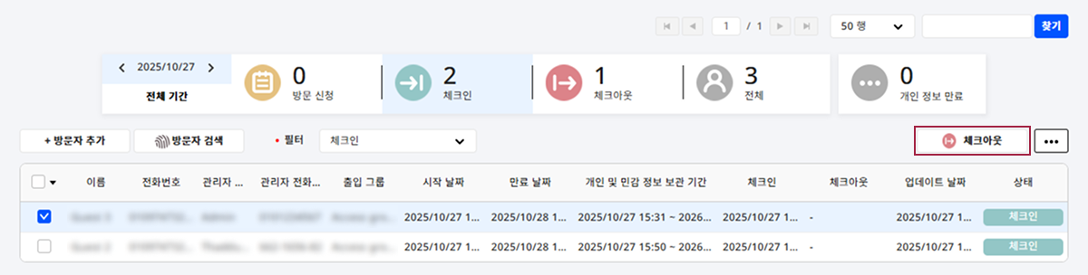 체크인 목록에서도 방문자를 선택해 체크아웃 처리할 수 있습니다. 목록에서 체크아웃할 방문자의 체크박스를 클릭하고 화면 오른쪽 상단의 체크아웃 버튼을 클릭하세요.