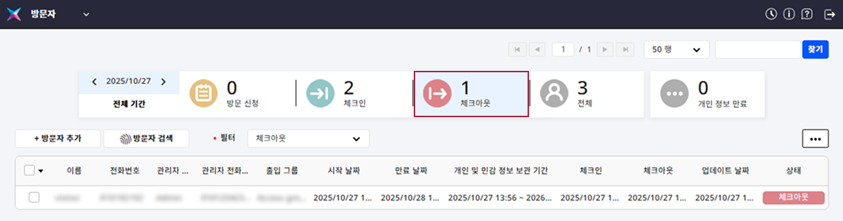 체크아웃 상태의 방문자를 확인하고 해당 방문 신청 정보를 사용해 다시 방문을 등록할 수 있습니다.
