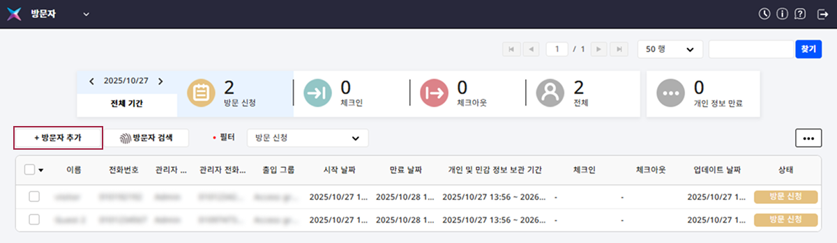 방문 신청을 승인하거나 수정할 수 있습니다. 관리자가 직접 방문자를 추가하거나 삭제할 수도 있습니다.
