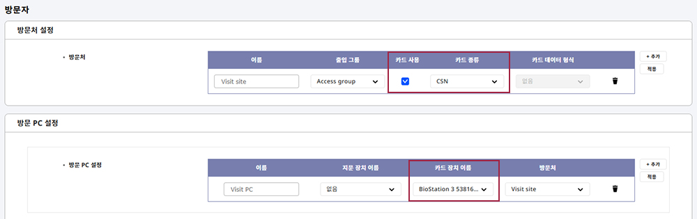 방문 PC에 카드 사용을 설정하려면 설정 → 방문자 메뉴에서 아래와 같은 최소 설정이 필요합니다. 자세한 내용은 다음 문서를 참고하세요.