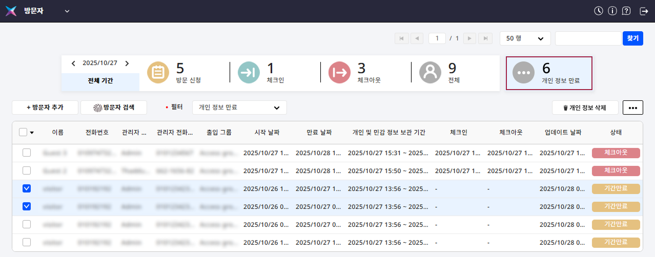 개인 정보 보관 기간이 초과한 방문자 목록이 표시되면 삭제할 방문자의 체크박스를 클릭하세요. 1명 이상을 선택할 수 있습니다.
